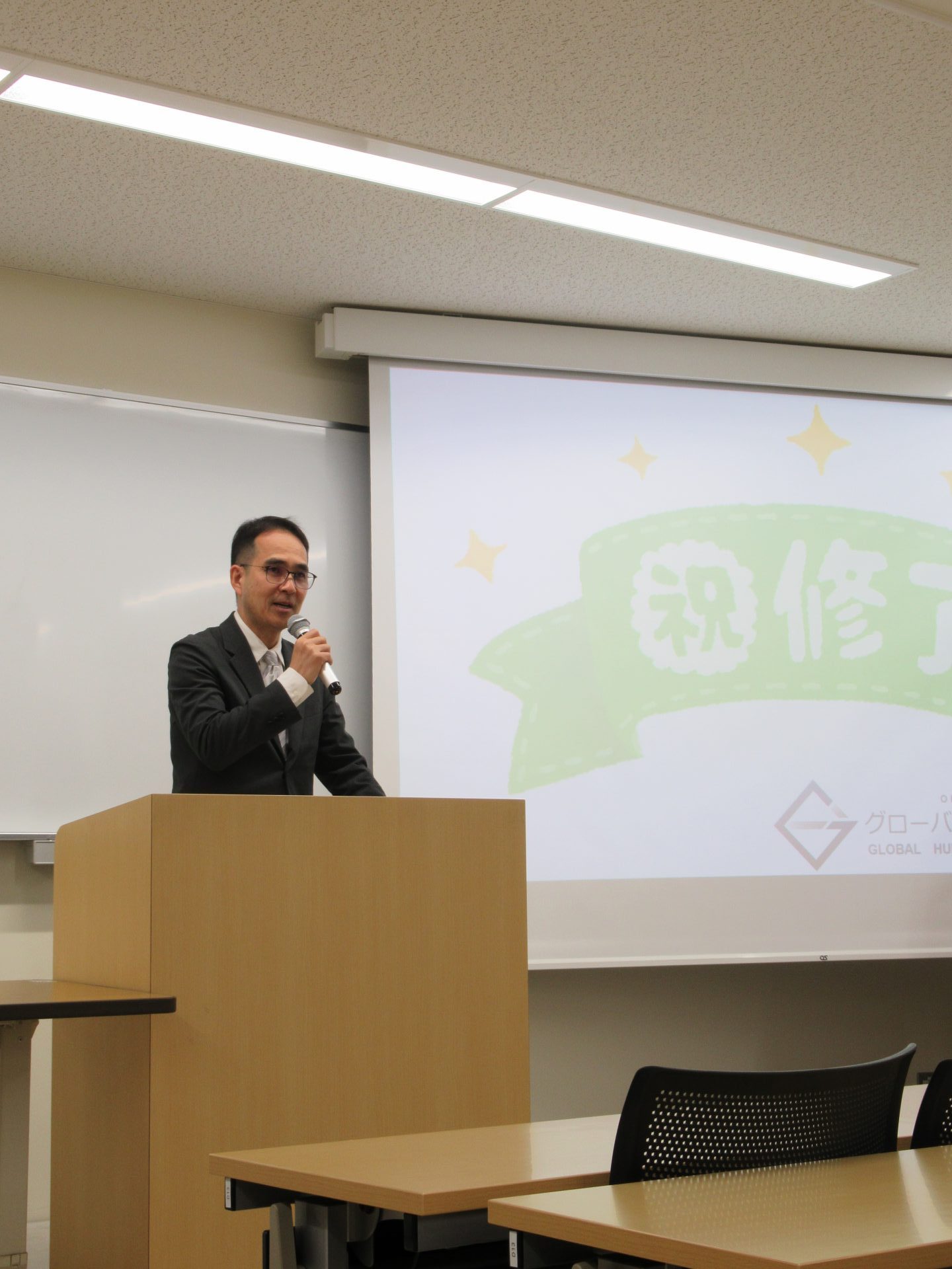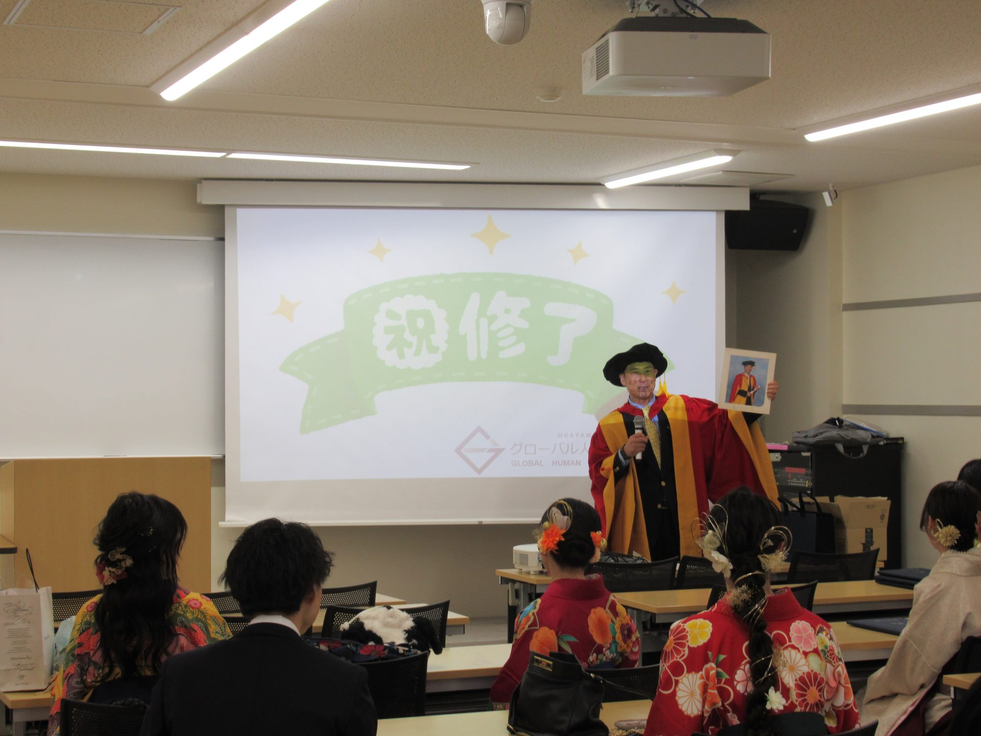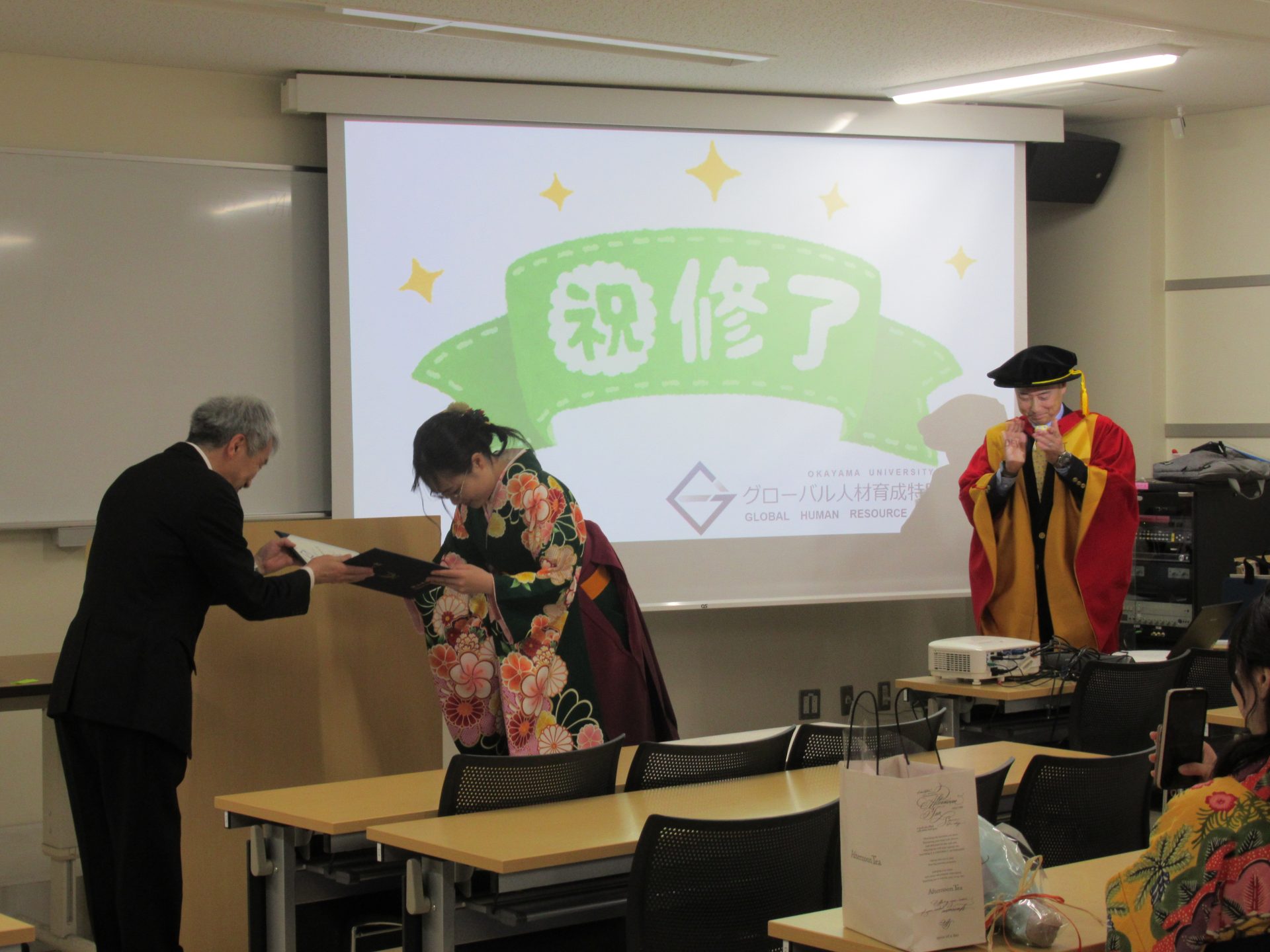 修了式が始まると,グローバル人材育成特別コース担当の稲森先生がガウン姿で登場し,和やかで賑やかな雰囲気の中,式がスタートしました。稲森先生による開会の挨拶の後,鈴木孝義グローバル人材育成院長より,受賞者一人ひとりに,グローバル人材育成院長賞が授与されました。